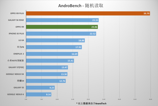 本 次开展测评的OPPO R9/R9 Plus都选用了4gB运行内存和64GB的内嵌存储,但事实上二者還是存有一些区别的。这儿必须表明的是在应用AndroBench的检测中,在 Buffer Size中持续(KB)中的选择项为256KB;任意(KB)则为初始值4k高清B,文件尺寸调节为512MB,检测三次分辨依据最大数据信息和AnandTech 网址发布的数据信息开展排列。
